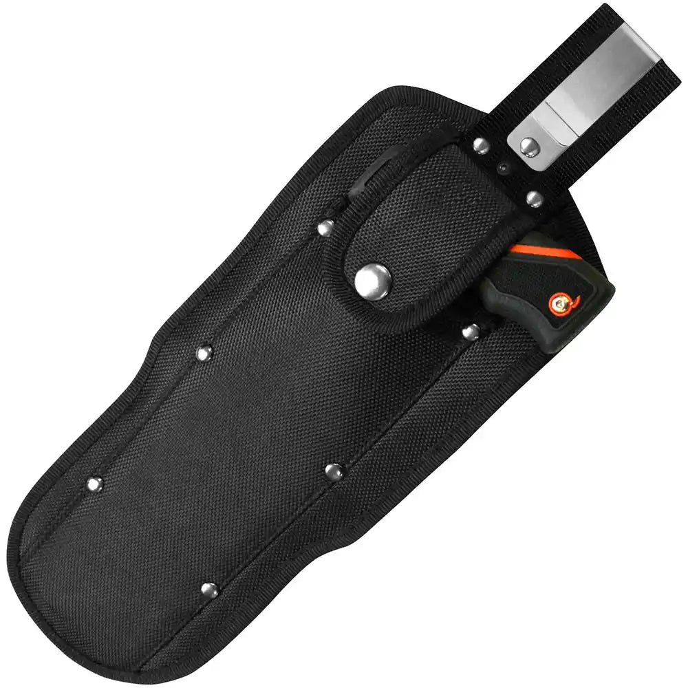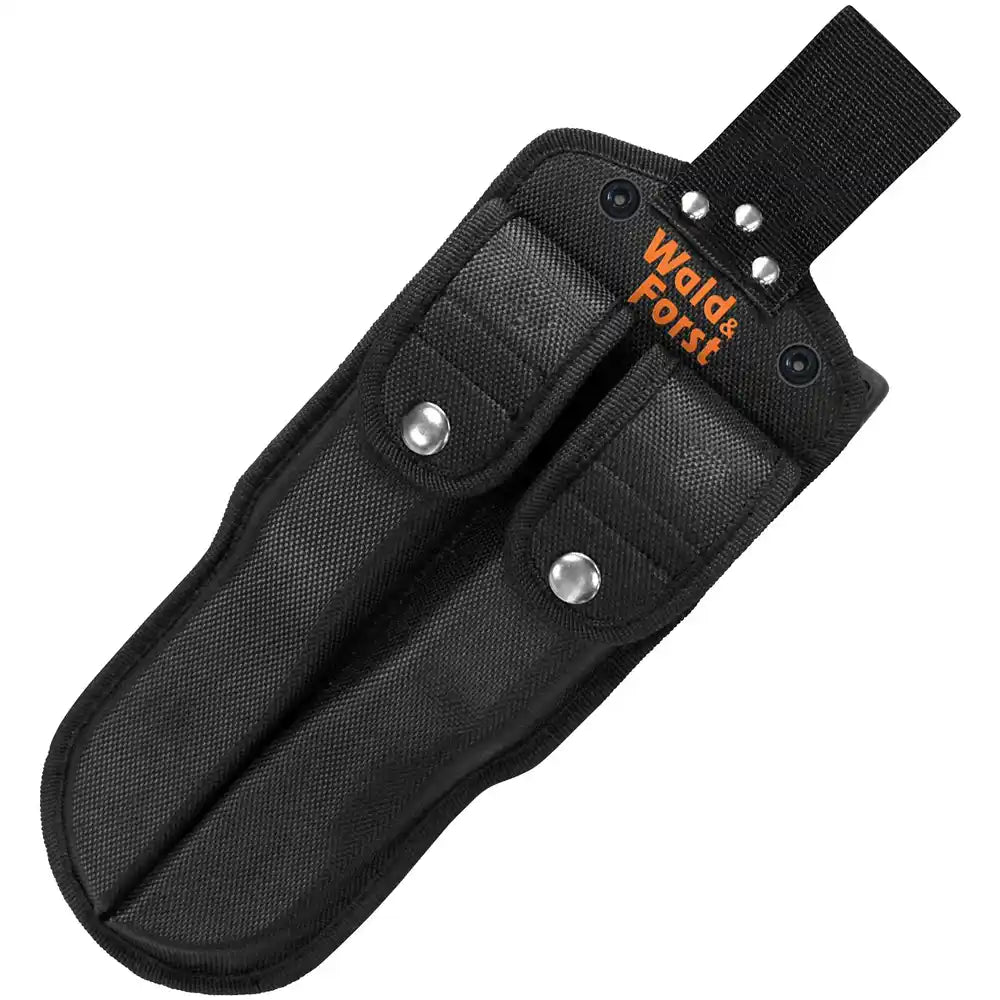 Die Säge findet ihren Platz auf der Rückseite des Etuis, während die beiden Messer auf der Vorderseite untergebracht sind. Alle drei Steckplätze sind mit Druckknöpfen gesichert, um ein versehentliches Herausfallen der Werkzeuge zu verhindern. Das Gürtel-Etui lässt sich einfach mittels eines Metall-Clips an jedem Gürtel oder Hosenbund befestigen.